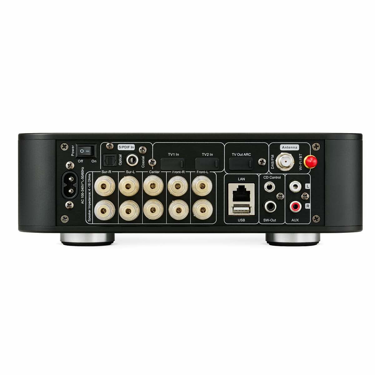 - 5.1 Surround-Ausgang, 5x 50 W @ 4 Ohm
