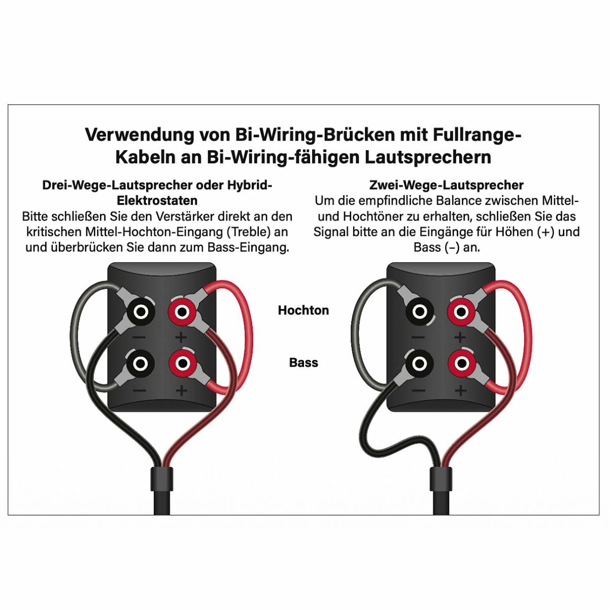 Important note: Please refer to the diagram for the optimal connection of single-wire speaker cables to bi-wire speaker terminals and select the jumper model that is suitable for your configuration. It is essential that you also note the direction of the cable jumper.