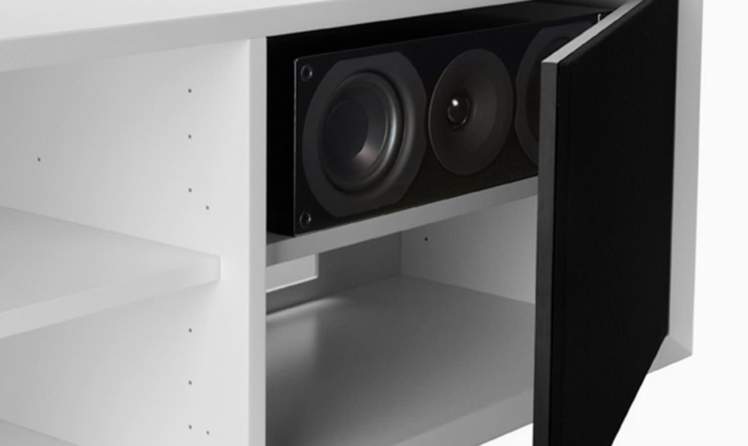 Damit haben Sie die Möglichkeit kompakte Lautsprecher oder auch einen Subwoofer im Möbel zu integrieren. Clic macht also Ihre Lautsprecher unsichtbar. So ist es denkbar, dass man auch die Rear-Lautsprecher eines Heimkino-Systems in einem rückwärtig zur Sitzpositiuon angebrachten Clic-Modul versteckt unterbringt. So ist Ihre Anlage zwar unsichtbar, Sie können sie aber trotzdem vom Sofa aus bedienen und durch die Gewebetüren Ihre Musik genießen.