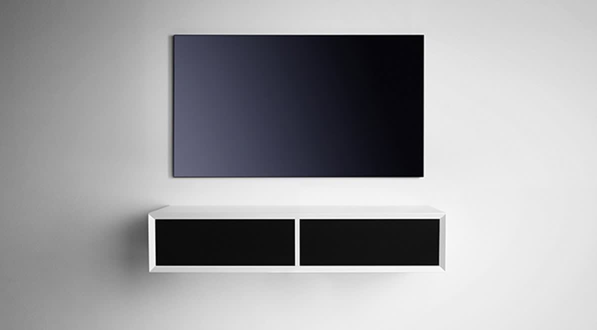 Das Clic Modell 120 ist ein flaches Audio-Sideboard für HiFi-Geräte zur Bodenaufstellung oder Wandmontage.