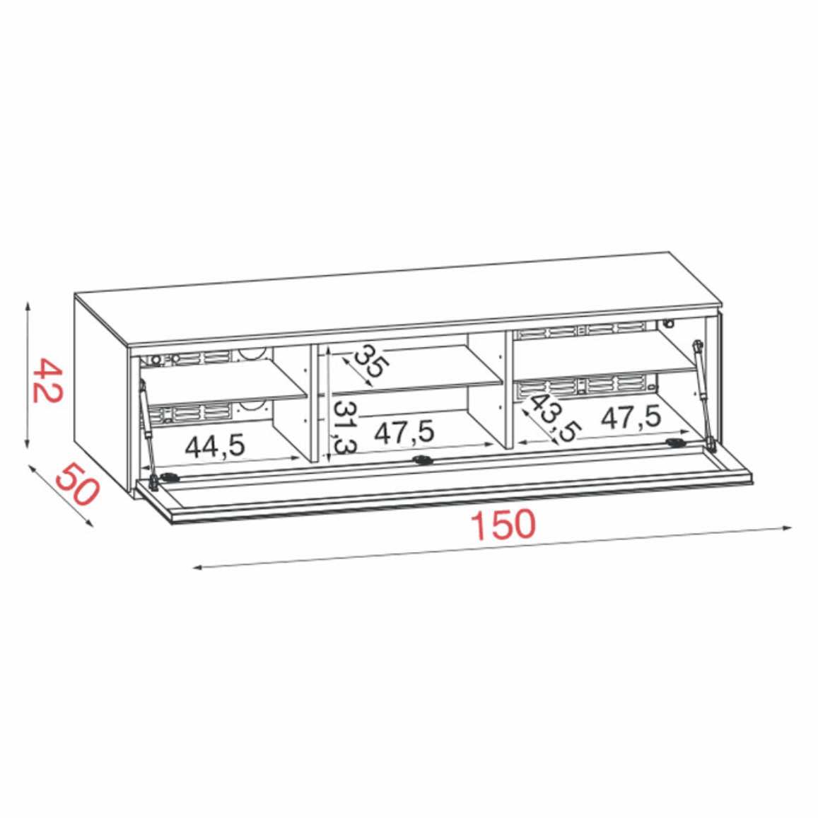 150 cm wide TV sideboard with glass front flap, LED lighting, central technology compartment, multiple socket, infrared-permeable front. Ideal for placing TVs with a screen diagonal of up to 65 inches.