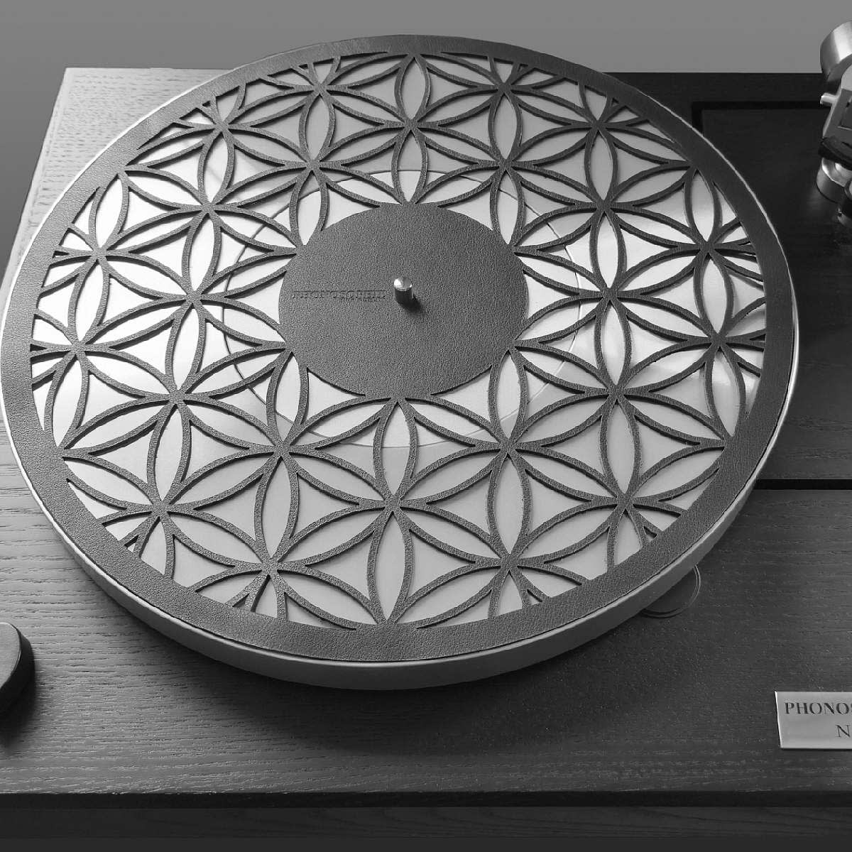 The aim is to achieve optimum damping of the record and turntable. Our tests have shown that a balance of low mass and a non-full-surface contact ensures extremely even control of the sound across the entire frequency spectrum. The pattern and engraving are cut with the utmost care using a laser. The leather is only 1.5–2 mm thick and weighs just 30–34 grams. In many cases, this eliminates the need to readjust the tone arm height and, if necessary, the subchassis. As leather is a natural material, there may be slight variations in thickness, weight and surface structure.