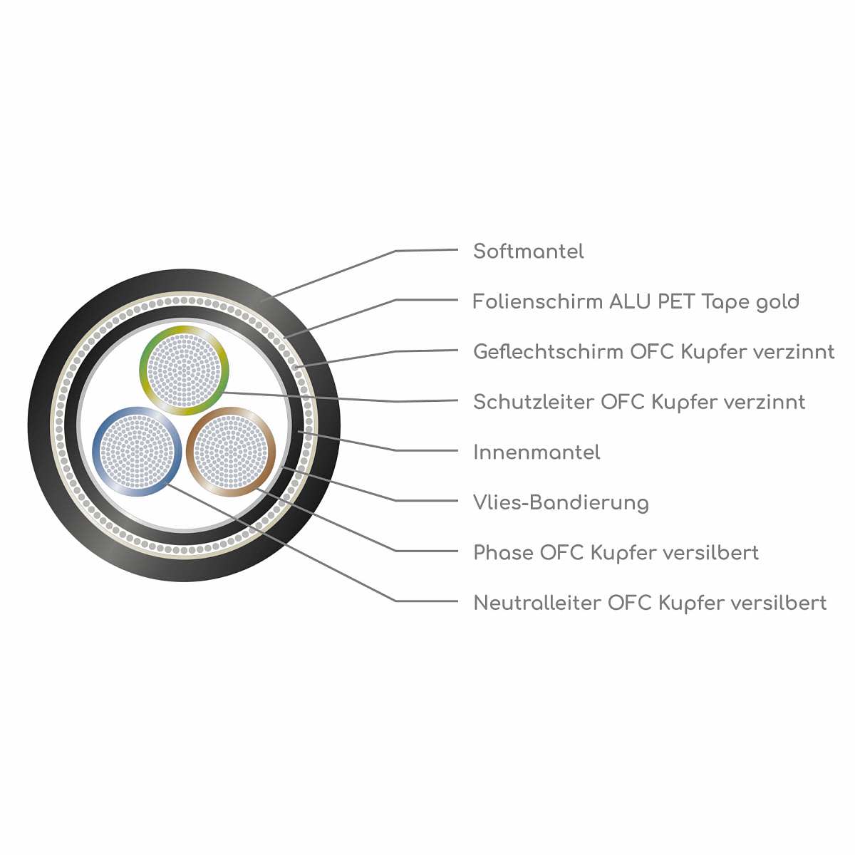 High-end power cable with double shielding, silver plating and 3x 2.5 mm² cores.