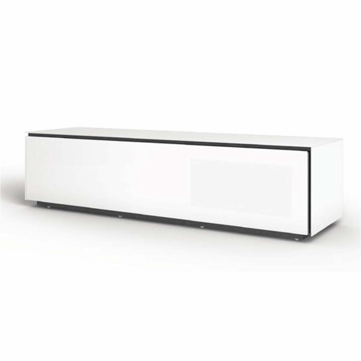 150 cm breiters TV-Sideboard mit Glas-Frontklappe, LED-Beleuchtung, Zentral-Technik-Fach, Mehrfach-Steckdose, Infrarot-durchlässiger Front. Ideal für die Aufstellung von Fernsehern bis 65 Zoll Bilddiagonale.